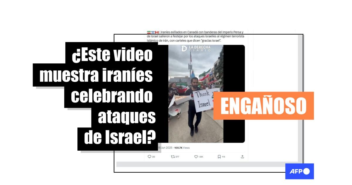 “Iraníes exiliados en Canadá con banderas del Imperio Persa y de Israel salieron a festejar por los ataques israelíes al régimen terrorista islámico de Irán’”, escribe un usuario en Instagram, junto un video que muestra a un hombre que reparte comida a personas que llevan banderas de Israel e Irán, mientras muestra un cartel con la inscripción en inglés “Gracias Israel”.