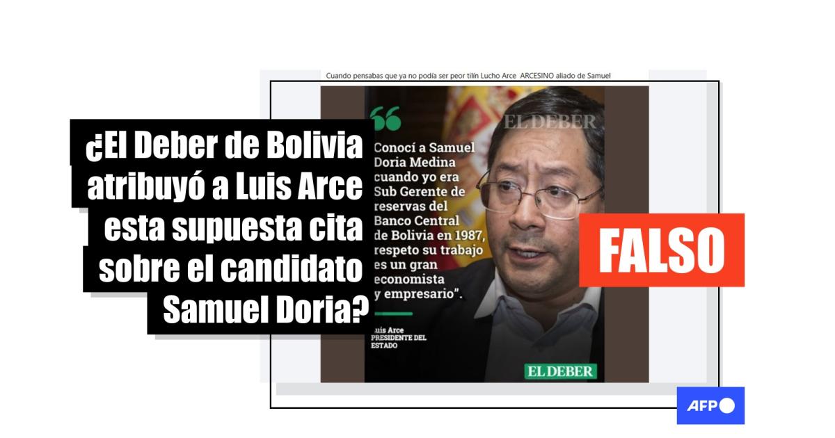 Una búsqueda en Google con la cita atribuida a Arce no arrojó registros de esa frase elogiando a Samuel Doria.