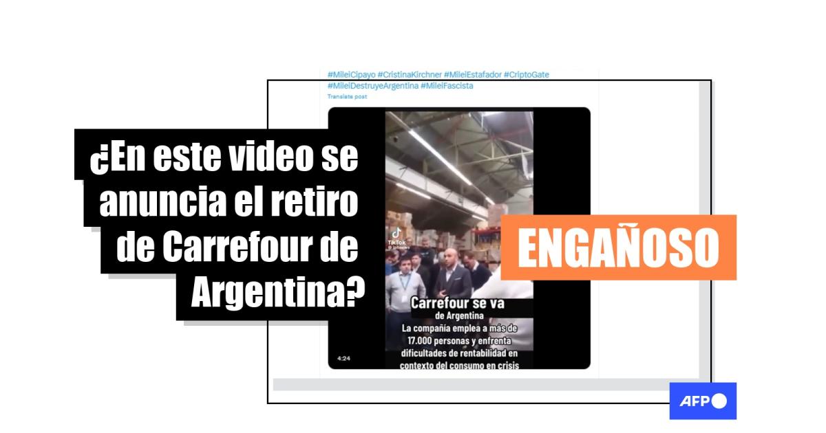 “CARREFOUR SE VA DEL PAIS... AQUI EL CEO EXPLICANDO A LA GENTE PORQUE... PATETICO EL EFECTO DEL GOBIERNO DEL DESQUICIADO #CongresoDeLaNacion #LaMarchaMasGrande #MileiTraidorALaPatria #MileiCipayo #CristinaKirchner #MileiEstafador #CriptoGate #MileiDestruyeArgentina #MileiFascista”, escribe un usuario en X que comparte una filmación donde se escucha a un hombre anunciar a sus empleados el cierre de la tienda.