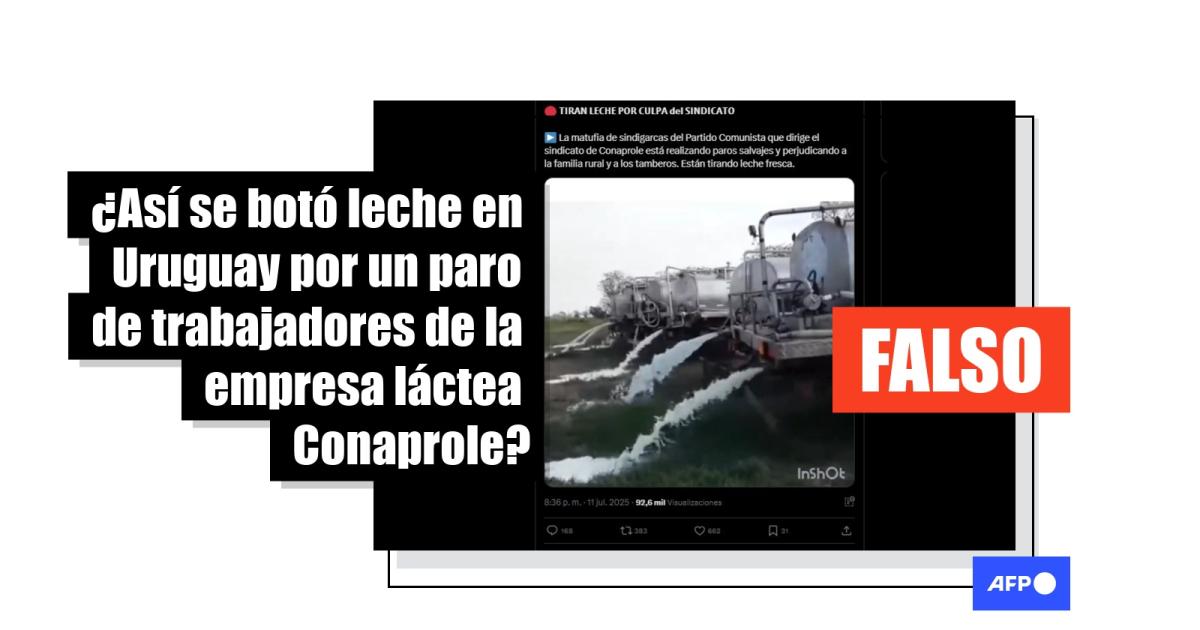 “TIRAN LECHE POR CULPA DEL SINDICATO. La matufia de sindigarcas del Partido Comunista que dirige el sindicato de Conaprole [Cooperativa Nacional de Productores de Leche] está realizando paros salvajes y perjudicando a la familia rural y a los tamberos. Están tirando leche fresca”, escribió un usuario en X que difunde el video.