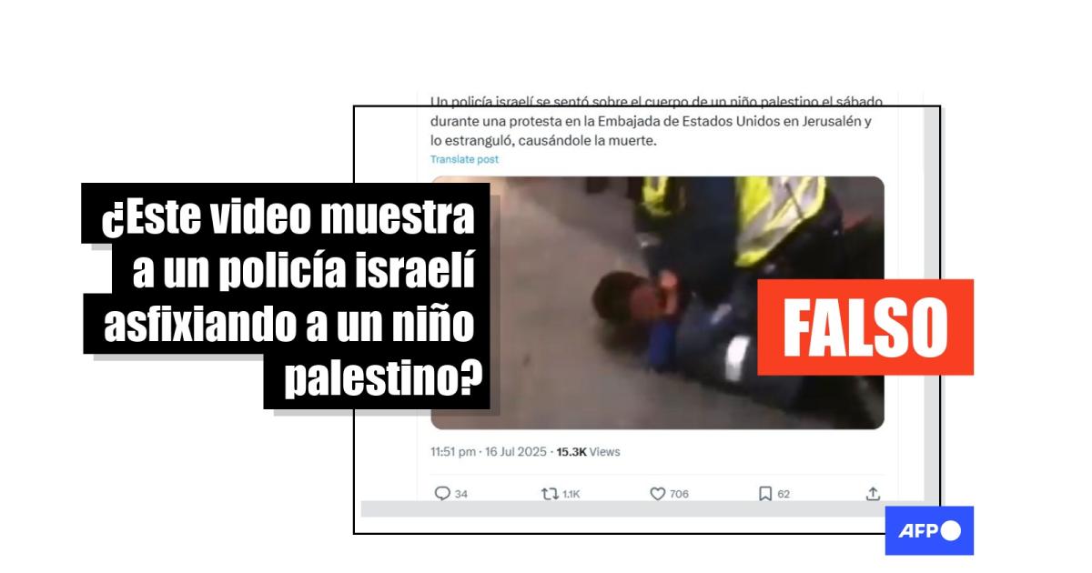 Un usuario escribe en X junto a la grabación: “Un policía israelí se sentó sobre el cuerpo de un niño palestino el sábado durante una protesta en la Embajada de Estados Unidos en Jerusalén y lo estranguló, causándole la muerte”.
