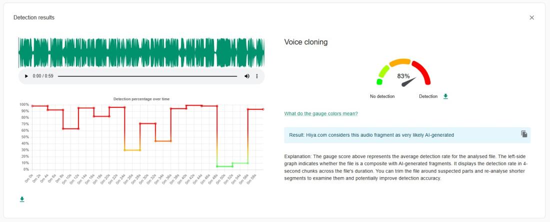 Un análisis del audio del contenido con el programa de detección de inteligencia artificial de InVID-Werify arrojó como resultado una “muy alta probabilidad” de haber sido creado de forma digital.