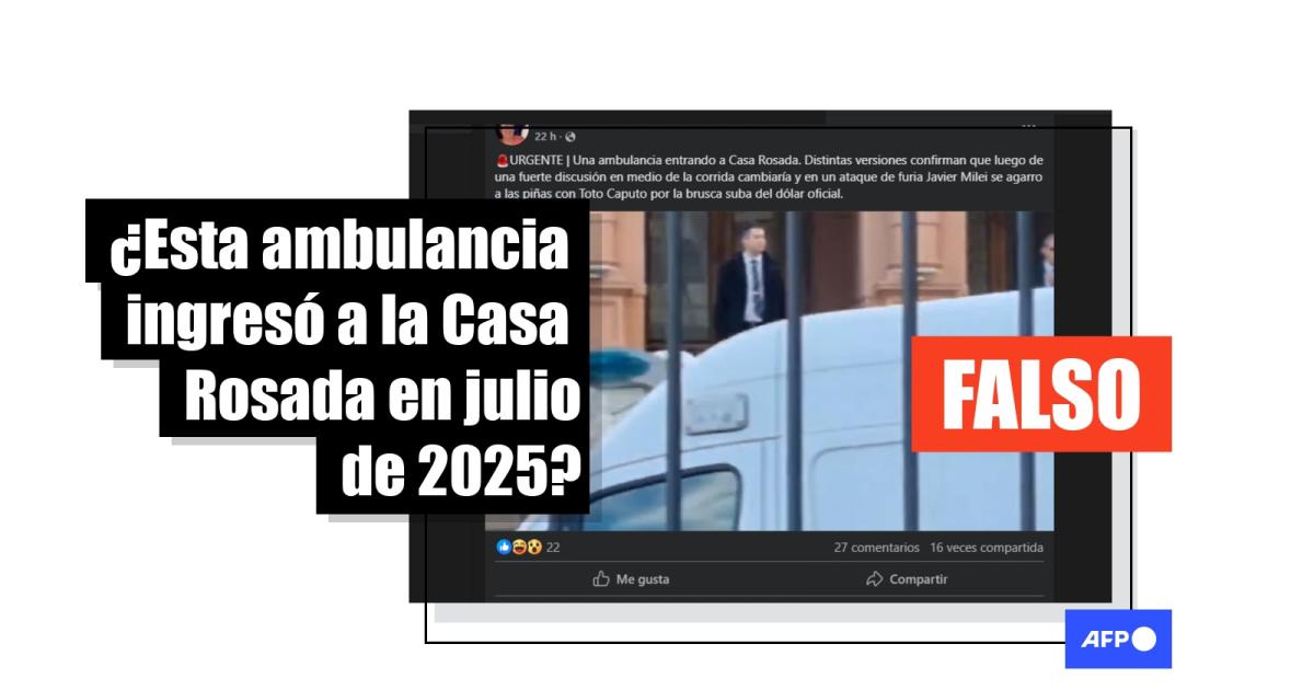 “URGENTE | Una ambulancia entrando a Casa Rosada. Distintas versiones confirman que luego de una fuerte discusión en medio de la corrida cambiaría y en un ataque de furia Javier Milei se agarro a las piñas con Toto Caputo por la brusca suba del dólar oficial”, publicó un usuario en X junto al video que muestra a una ambulancia ingresando a la Casa Rosada, sede del Gobierno argentino. El mensaje fue replicado en Facebook y TikTok.