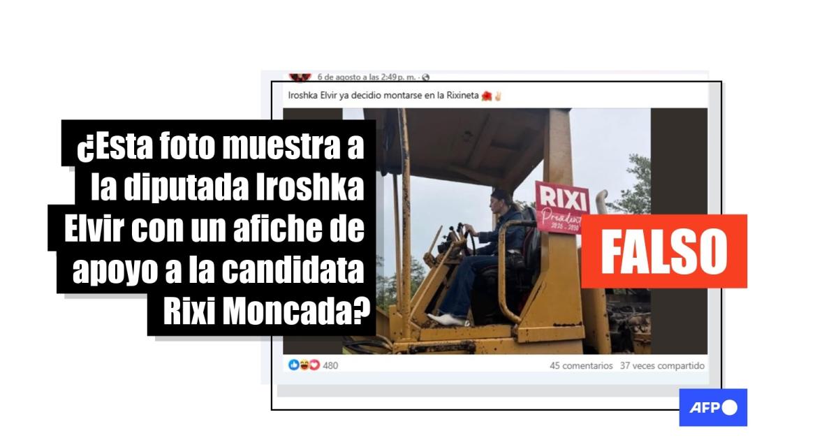 Foto de la hondureña Iroshka Elvir con una pancarta en apoyo a la candidata Rixi Moncada es un montaje