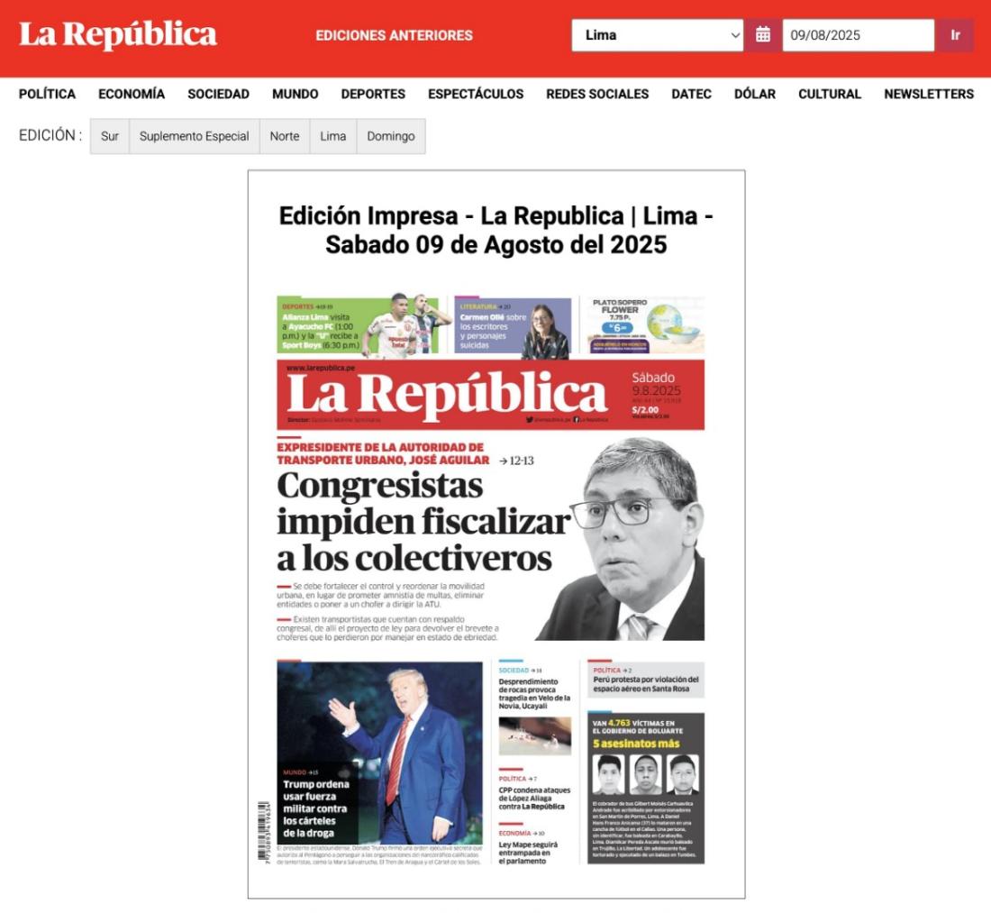 Una búsqueda en el sitio web del diario permitió ubicar la edición impresa del 9 de agosto de 2025, fecha que se ve en la imagen viral. La portada original no incluye la frase atribuida a Gorriti. “Congresistas impiden fiscalizar a los colectiveros”, fue el titular principal de esa fecha.