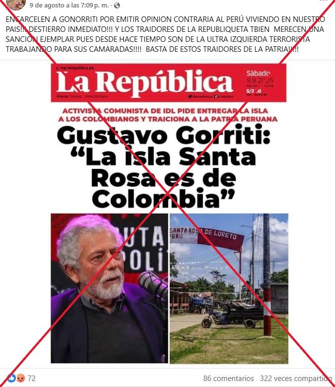 “Gustavo Gorriti: ‘La isla Santa Rosa es de Colombia’”, se lee en publicaciones en X, Instagram y Facebook, como si fuera un titular en primera plana del medio La República, de Perú.
