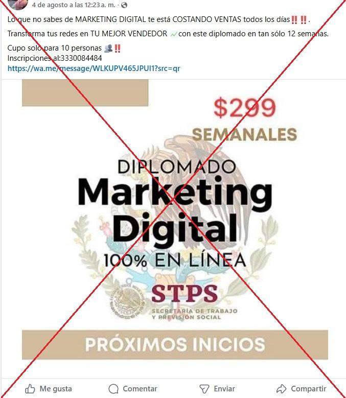 La Secretaría del Trabajo y Previsión Social de México no vende diplomados de mercadotecnia digital