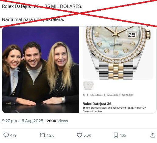“Rolex Datejust 36 = 35 MIL DÓLARES. Nada mal para una pastelera”, escribe un usuario en X en referencia a Karina Milei, quien antes de dedicarse a la política trabajaba como pastelera.