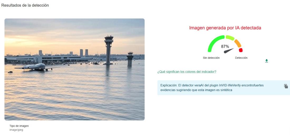 Un análisis de la imagen con la herramienta de detección de imágenes sintéticas VeraAI de InVid-WeVerify arrojó un 87% de probabilidad de que el material haya sido generado con IA.