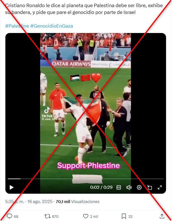Pero el video de un futbolista con la bandera palestina que se ha difundido en agosto de 2025 no muestra a Cristiano Ronaldo.