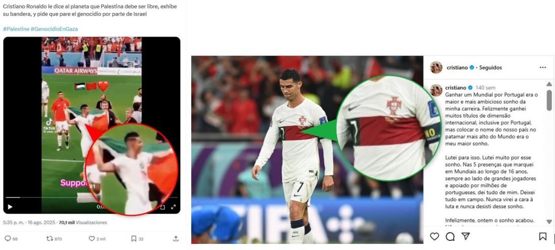 “Hoy por hoy, el mundo es palestino!!! Respeto para Cristiano Ronaldo, los ideales de paz y de justicia: NO SE VENDEN!!! DESDE EL RÍO HASTA EL MAR, PALESTINA LIBRE SERÁ!!!”, dice una publicación en Facebook acompañada de un video que muestra a un jugador de fútbol con la camiseta número 18 y una bandera palestina.