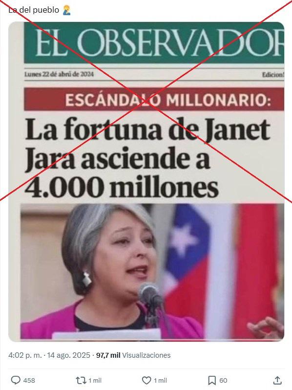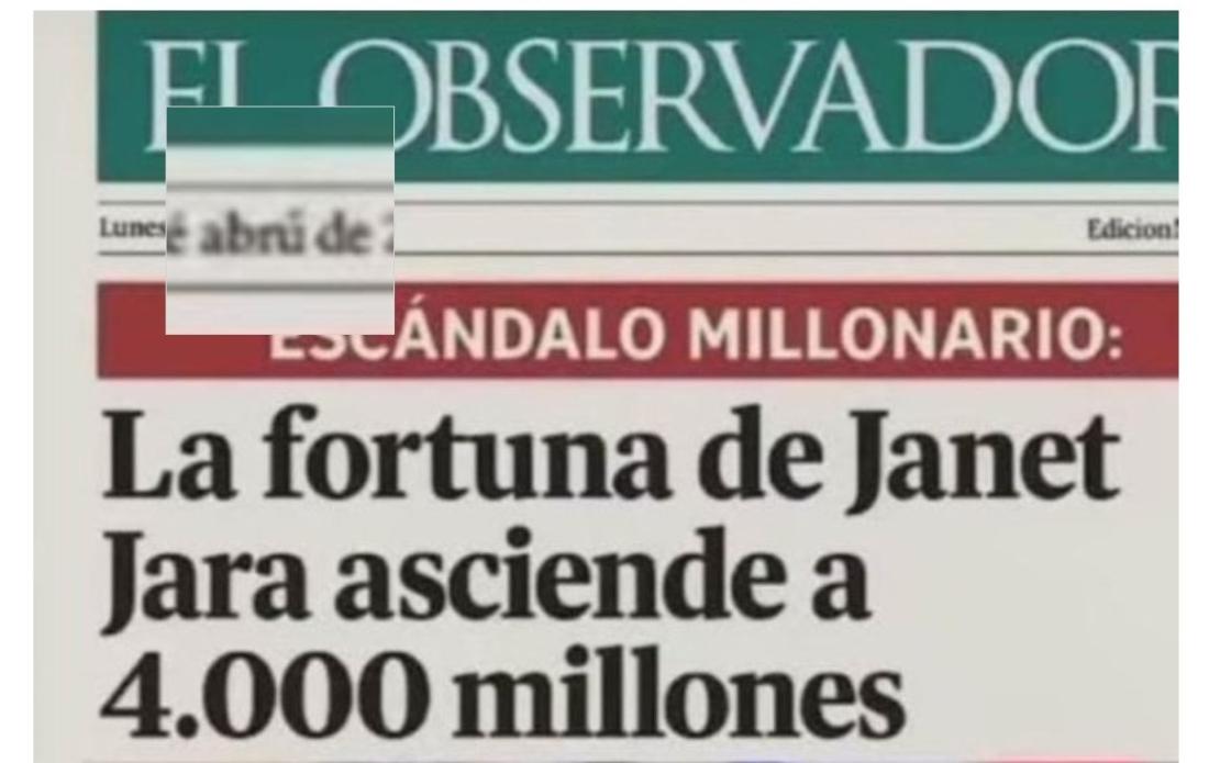 “ESCÁNDALO MILLONARIO: La fortuna de Janet Jara asciende a 4.000 millones”, señala la supuesta portada de El Observador compartida en Instagram, Facebook, Threads, X y TikTok con una fotografía de Jeannette Jara.