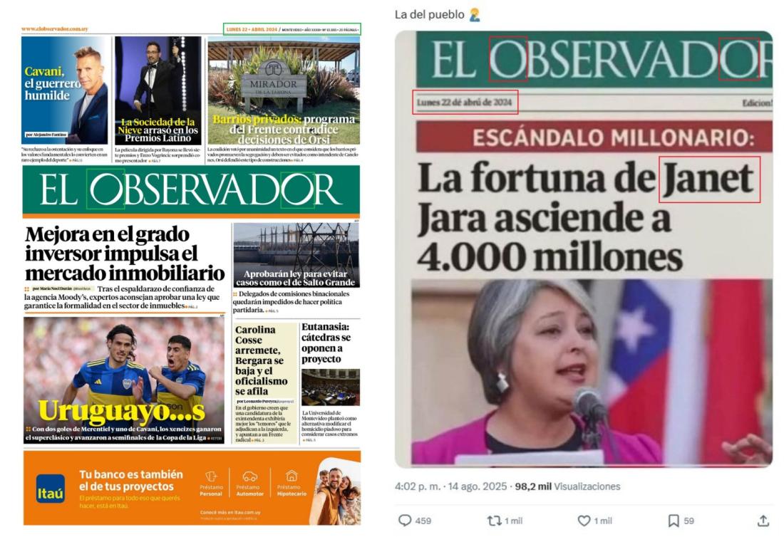 En efecto, al hacer una comparación se ven inconsistencias gráficas, como por ejemplo: la letra “O” del logo del periódico tiene una grafía distinta, la fecha correcta se ubica arriba del logo, y el nombre de la candidata chilena está mal escrito. Lo correcto es Jeannette Jara, no “Janet”.