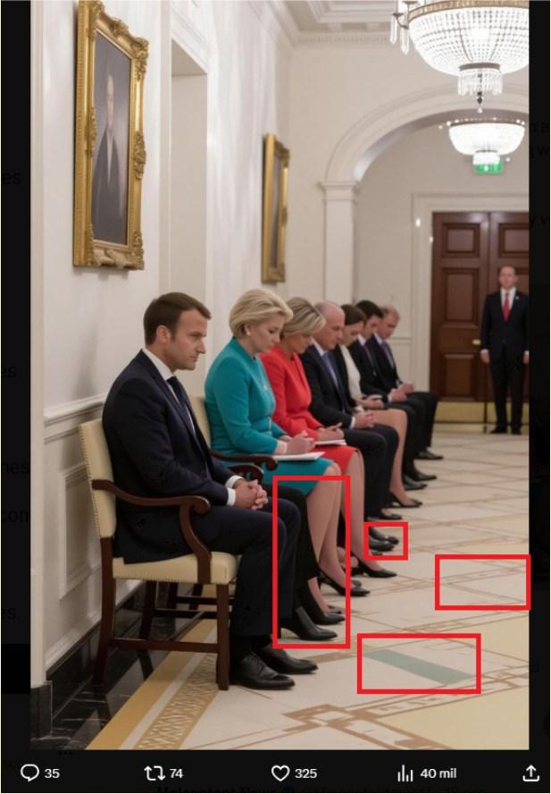 “Esta imagen está dando la vuelta al mundo… Los Líderes Europeos que iban blindando a Zelensky tuvieron que esperar afuera mientras se realizaba la reunión TRUMP - ZELENSKY! ¿Humillados o son Respetuosos ?”, dice una publicación que comparte la supuesta imagen en X, Instagram, TikTok y Facebook.