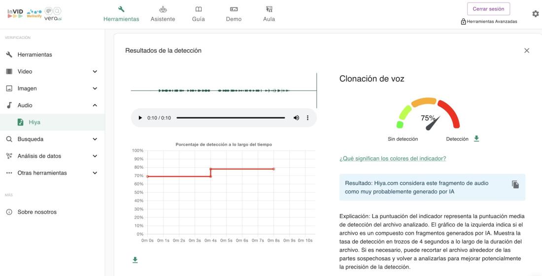 AFP Factual utilizó el detector de clonación de voz que ofrece la extensión InVID-WeVerify para analizar el audio de la grabación viralizada. La herramienta concluyó que el material posee un 75% de probabilidades de haber sido fabricado por inteligencia artificial (IA).