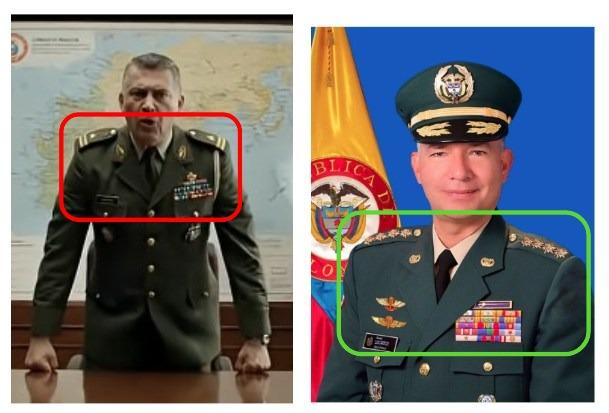Del mismo modo, el uniforme del comandante que aparece en el video viral es diferente al de Cardozo Santamaría. Según el retrato del general en el sitio web de las Fuerzas Militares de Colombia, su traje militar presenta elementos diferentes a los del video de redes sociales.