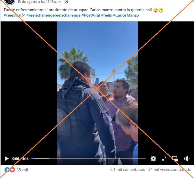 “Guardia Civil agrede al presidente municipal de Uruapan sin saber quién era”, dice la descripción de un video publicado en Facebook. Y continúa: “Un fuerte enfrentamiento se registró entre elementos de la Guardia Civil y el presidente municipal de Uruapan, Carlos Manzo, luego de que los agentes, sin percatarse de su identidad, lo agredieran físicamente. (...) Manzo respondió cacheteando a algunos elementos”.