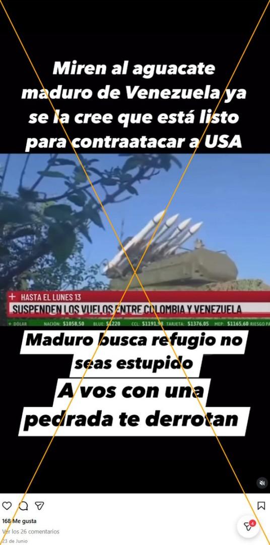 La afirmación se comparte junto con imágenes del medio argentino La Nación Más, en el que se escucha: “Miren esto, se dan a conocer las primeras imágenes de la decisión del régimen de Nicolás Maduro de desplegar el sistema de misiles antiaéreos en Venezuela. Quien difunde las imágenes es Domingo Hernández Lárez, comandante estratégico operacional de la Fuerza Armada”.
