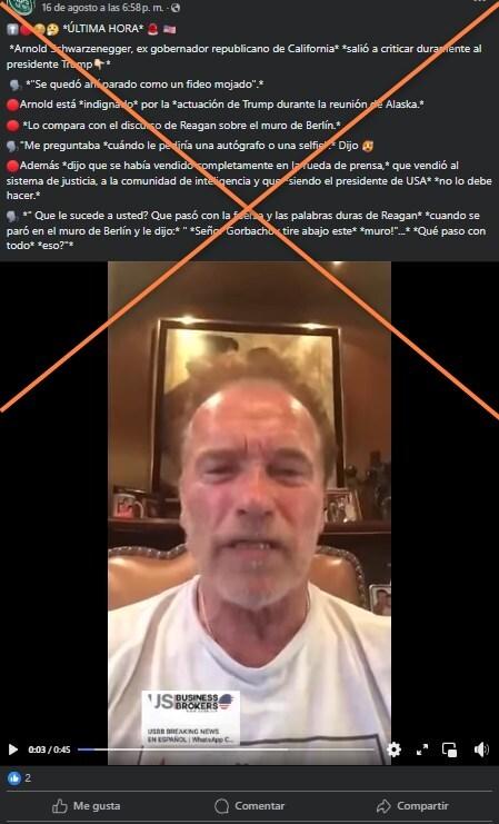 “ÚLTIMA HORA Arnold Schwarzenegger, ex gobernador republicano de California salió a criticar duramente al presidente Trump ‘Se quedó ahí parado como un fideo mojado’. Arnold está indignado por la actuación de Trump durante la reunión de Alaska”, afirma una publicación en Facebook