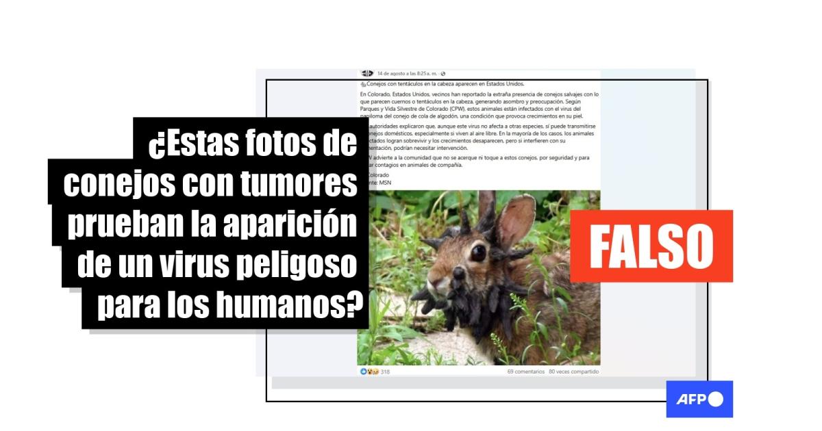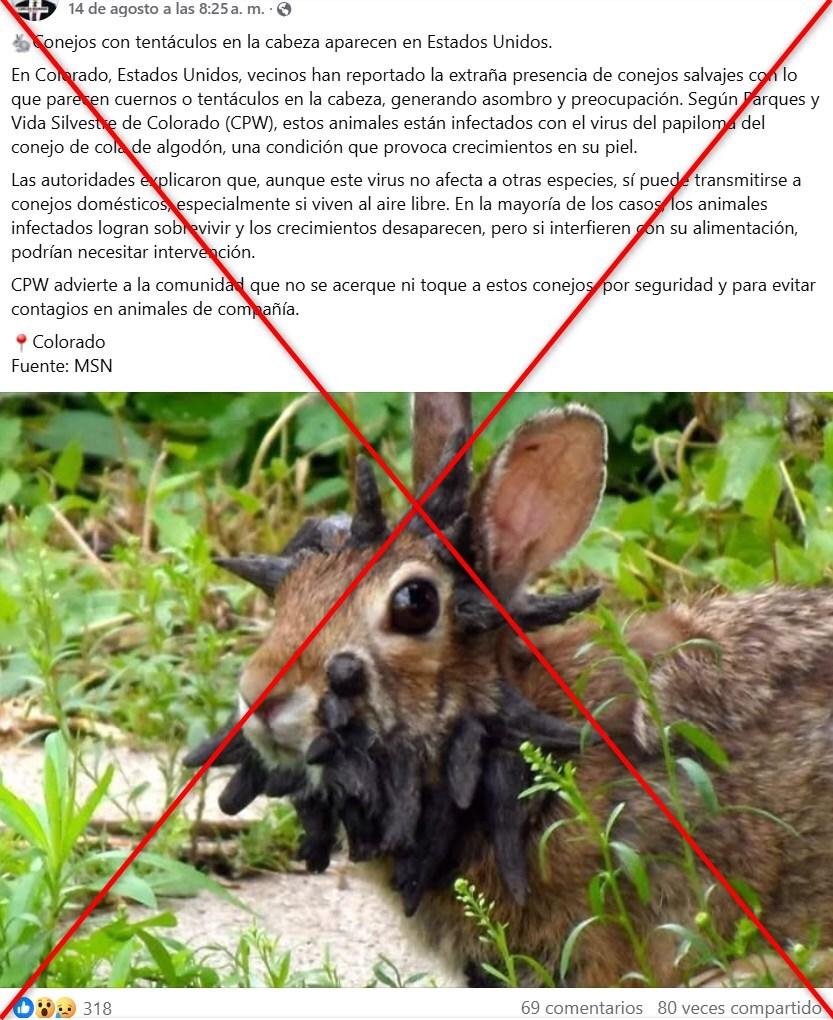 Publicaciones similares circulan en Facebook (1, 2) que señalan que “conejos con tentáculos en la cabeza aparecen en Estados Unidos” y están infectados con el virus del papiloma del conejo que “no afecta a otras especies”, pero que las autoridades pidieron a la población que “no se acerque ni toque a estos conejos, por seguridad y para evitar contagios en animales de compañía”.