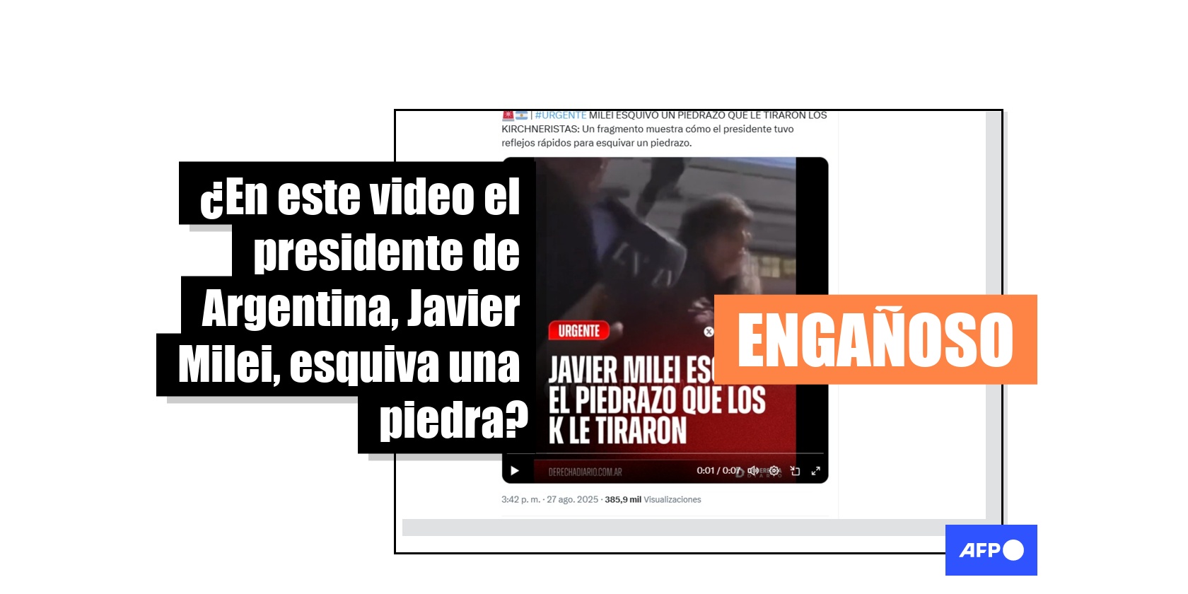 “#URGENTE MILEI ESQUIVÓ UN PIEDRAZO QUE LE TIRARON LOS KIRCHNERISTAS: Un fragmento muestra cómo el presidente tuvo reflejos rápidos para esquivar un piedrazo”, dice un usuario en X, junto a imágenes de la caravana de Milei en Lomas de Zamora, donde se escucha una voz fuera de cámara que dice: “Le rozó una piedra por la cabeza al presidente Javier Milei”.