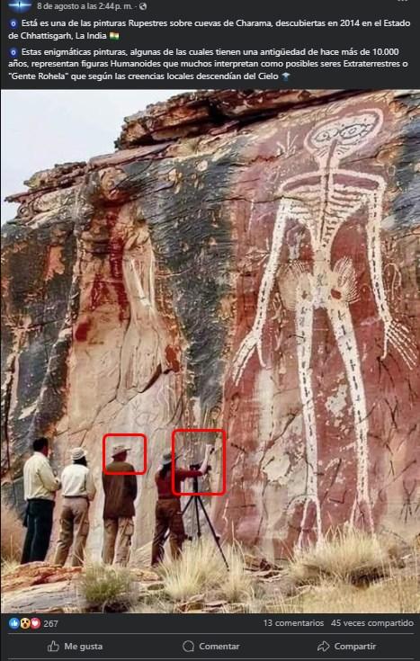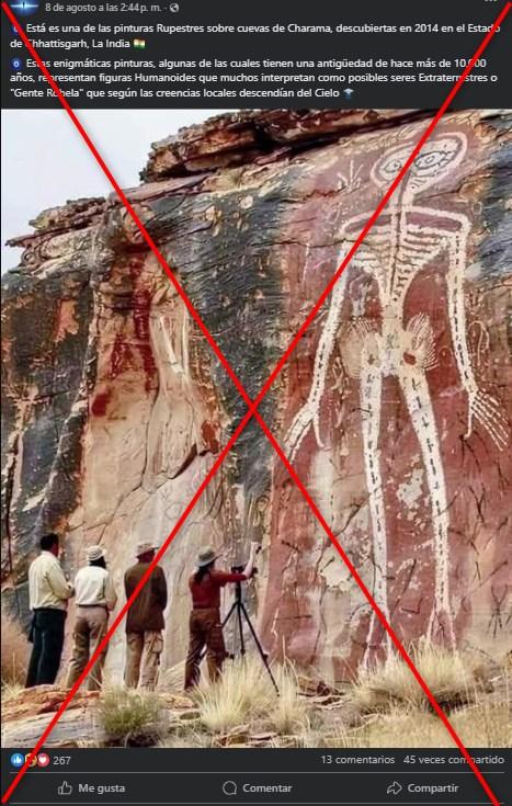 “En las remotas cuevas de Charama, en el estado indio de Chhattisgarh, arqueólogos descubrieron misteriosas pinturas rupestres con más de 10.000 años de antigüedad que desafían toda lógica”, afirma una publicación en Facebook.