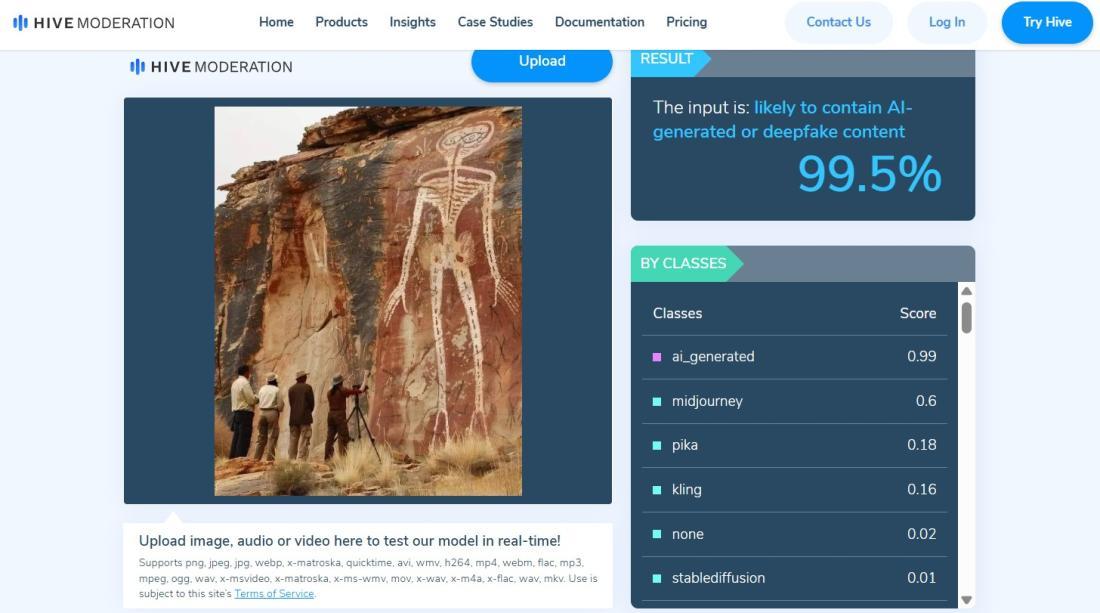 Un análisis de la imagen con la herramienta Hive Moderation, que permite detectar manipulaciones digitales, indica un 99,5% de que la instantánea “contenga contenido generado por IA”.