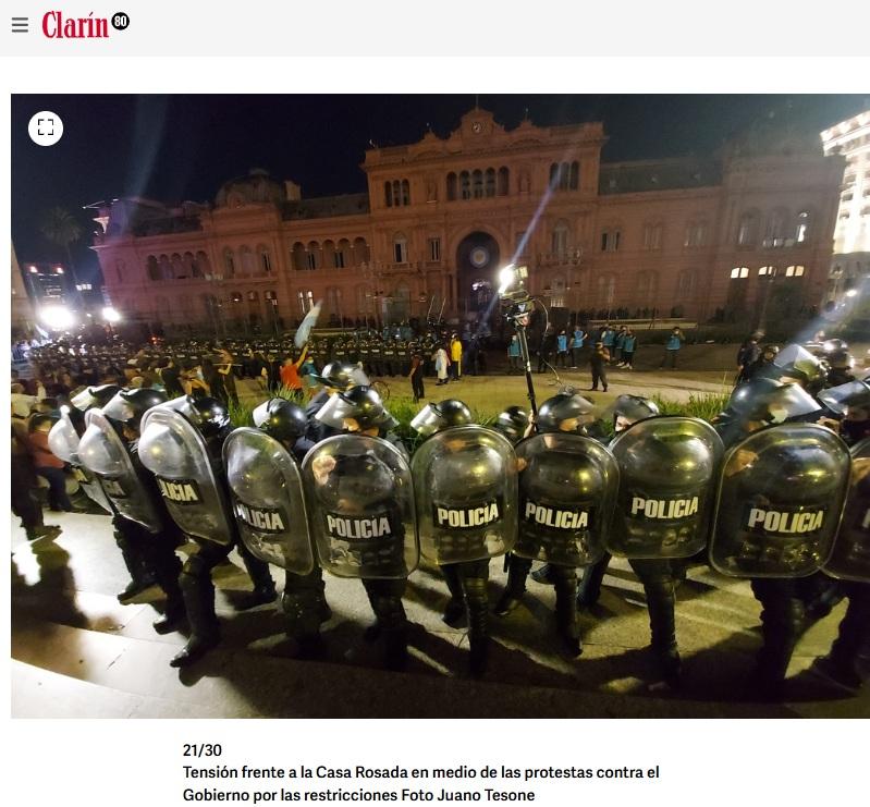 Entre las instantáneas se encuentra la compartida por los usuarios, bajo la descripción: “Tensión frente a la Casa Rosada en medio de las protestas contra el Gobierno por las restricciones”. La imagen es atribuida al fotógrafo Juano Tesone, quien publicó otro registro del operativo policial, desde una perspectiva diferente, en su cuenta en Instagram.