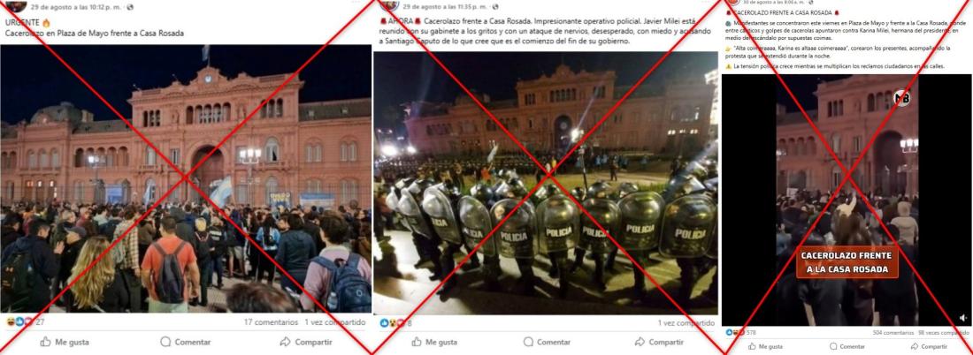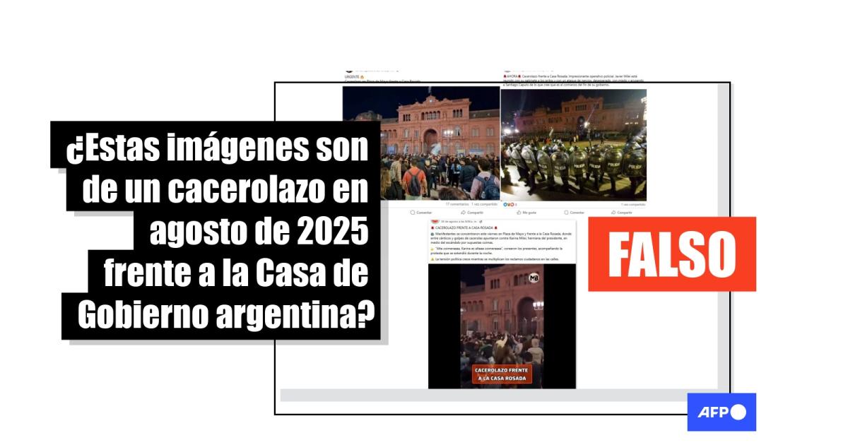 También ha circulado en Facebook y X una instantánea que muestra un operativo policial frente a la Casa Rosada, junto a la leyenda: “AHORA. Cacerolazo frente a Casa Rosada. Impresionante operativo policial. Javier Milei está reunido con su gabinete a los gritos y con un ataque de nervios, desesperado, con miedo y acusando a Santiago Caputo de lo que cree que es el comienzo del fin de su gobierno”.