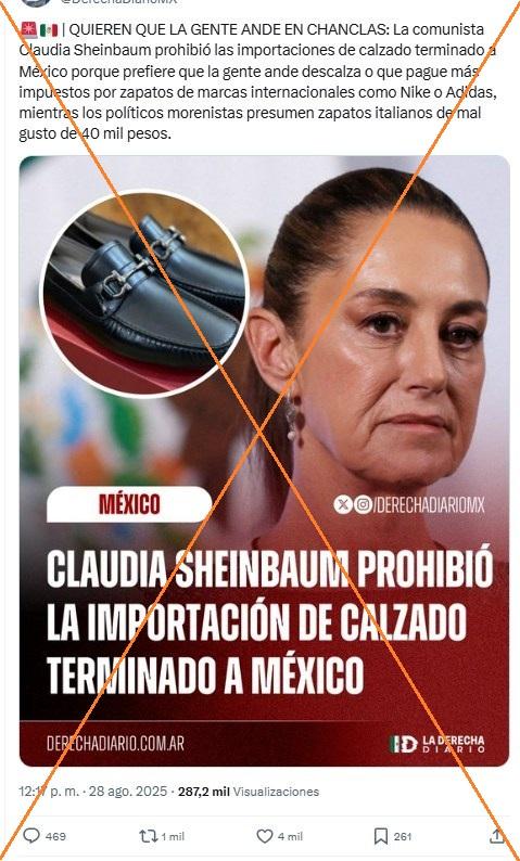 “Claudia Sheinbaum prohibió la importación de calzado terminado a México”, indica una imagen con la fotografía de Sheinbaum compartida en X, Instagram y Facebook. “Nos quieren regresar a finales de los 70's”, comenta un usuario.