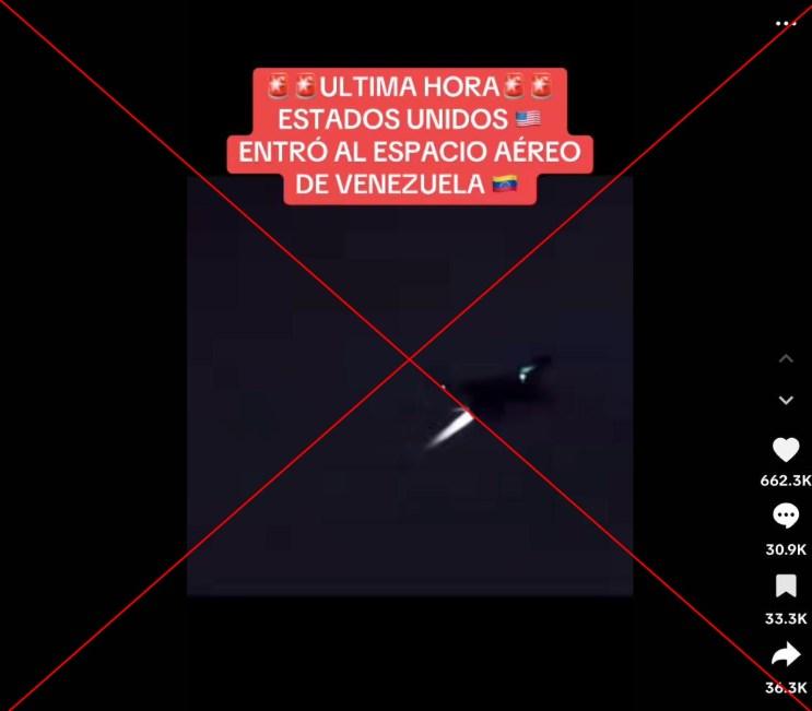 “¡URGENTE! Estados Unidos entra al espacio aéreo de Venezuela”, señalan usuarios al compartir un video en Instagram, Facebook, Threads y TikTok.