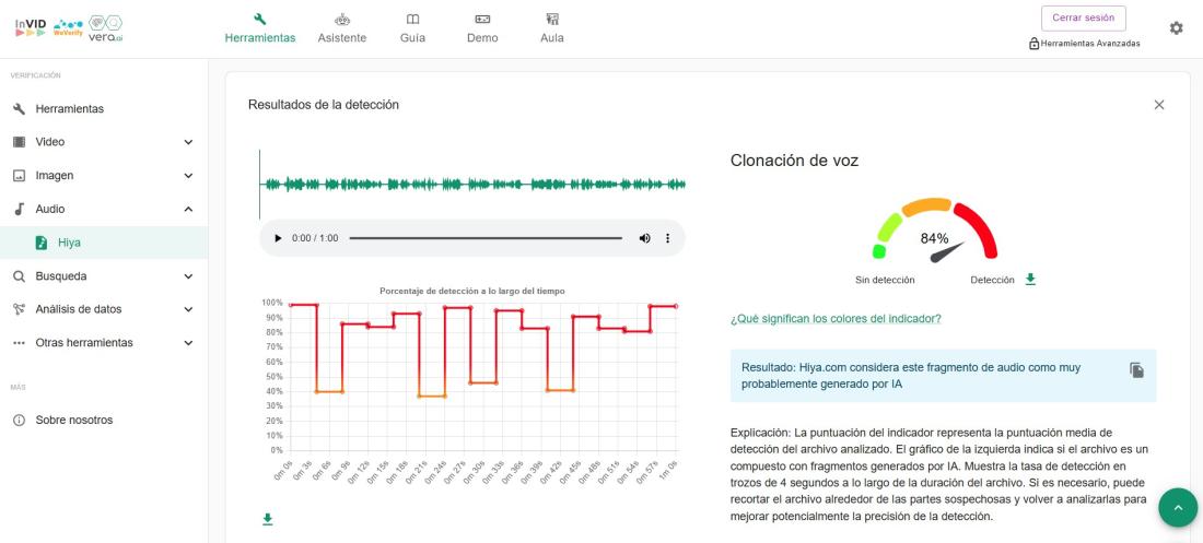 AFP Factual utilizó el detector de clonación de voz que ofrece la extensión InVID-WeVerify para analizar el audio del contenido viral. La herramienta consideró la voz del exministro boliviano como “muy probablemente generada” con inteligencia artificial (IA), al igual que la voz de la presentadora de televisión.