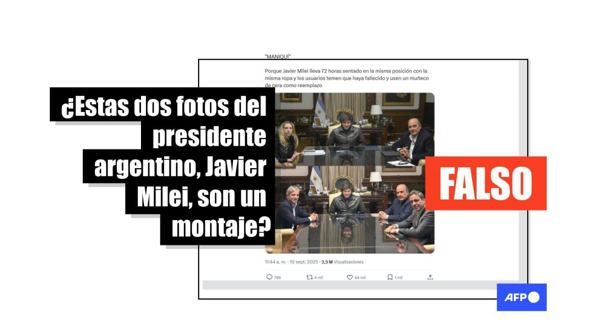 “Le sacaron una foto a Milei y es la que usan para ponerlo en todas las reuniones”, afirma un usuario en una publicación en X junto con ambas imágenes. “¿Insertaron al mismo Milei en las dos mesas o siempre sale idéntico en todas las fotos, incluyendo el lugar que ocupa en la silla?”, cuestiona otro usuario.