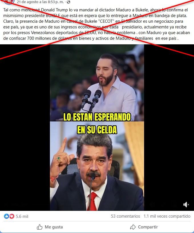“Tal como mencioné Donald Trump lo va mandar al dictador Maduro a Bukele, ahora lo confirma el mismisimo presidente BUKELE que está en espera que lo entregue a Maduro en bandeja de plata”, dice una publicación en Facebook que incluye un video que muestra a Bukele supuestamente declarando: “Estamos en espera que el gobierno de los Estados Unidos nos entregue en bandeja de plata a Nicolás Maduro. Hicimos un trato para que cumpla su condena aquí en El Salvador”