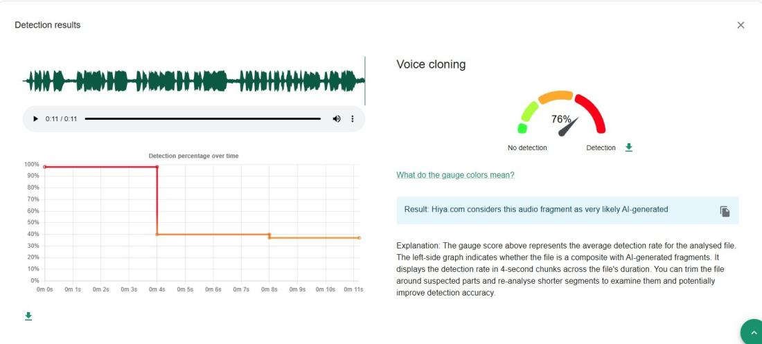 Además, un análisis con la herramienta Hiya, de InVID WeVerify del extracto del audio viral en el que habla Maduro, arrojó un 76% de probabilidad de que la voz haya sido generada digitalmente.