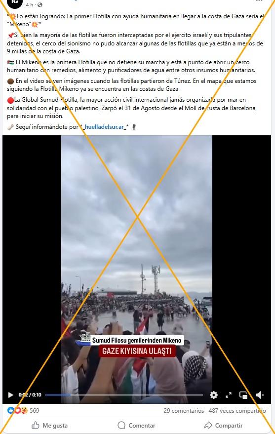 “Lo están logrando: La primer Flotilla con ayuda humanitaria en llegar a la costa de Gaza es el ‘Mikeno’” o “UN SÓLO BARCO LO LOGRO #GlobalSumudFlotilla #GAZA EL BARCO MIKENO ROMPE EL ASEDIO AL LLEGAR A GAZA!!!”, es lo que señalan los usuarios al compartir el video en Facebook, X e Instagram.
