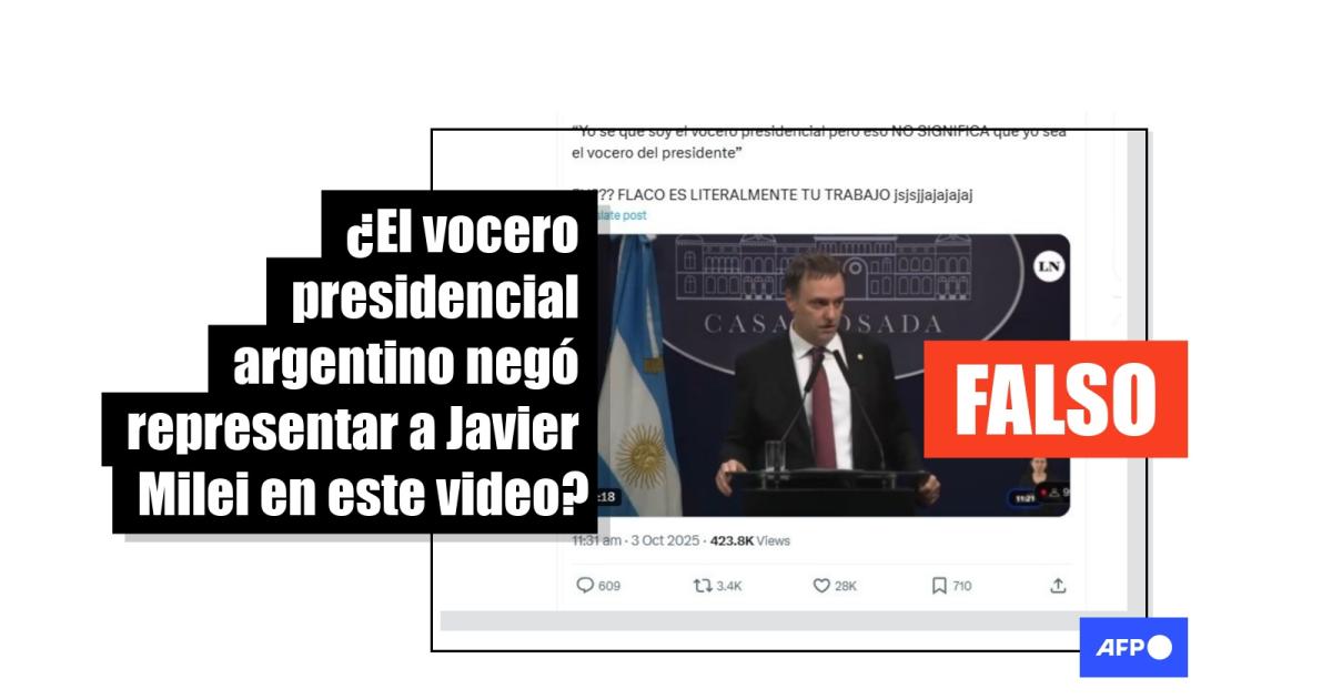 Un usuario comparte en X un video en el que el vocero presidencial, Manuel Adorni, afirma: “Efectivamente soy el vocero del presidente y el vocero, en tal caso, del gobierno nacional. Las preguntas que le tengas que hacer a él no te las puedo responder yo, porque no soy ni su vocero ni su representante ni nada que se le parezca”.