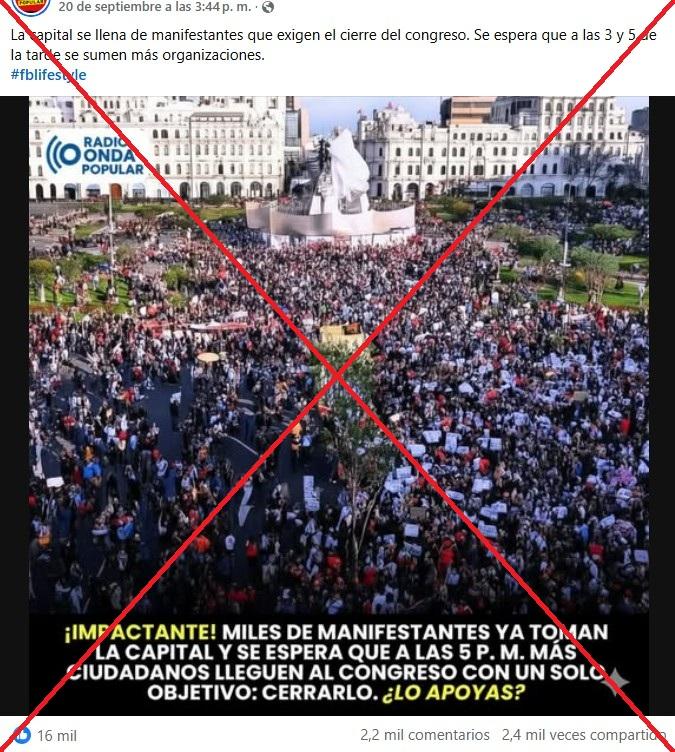 “¡Impactante! Miles de manifestantes ya toman la capital y se espera que a las 5 p. m. más ciudadanos lleguen al Congreso con un solo objetivo: cerrarlo. ¿Lo apoyas?”, se lee en publicaciones en Facebook junto con una foto de una gran aglomeración en el centro de Lima.