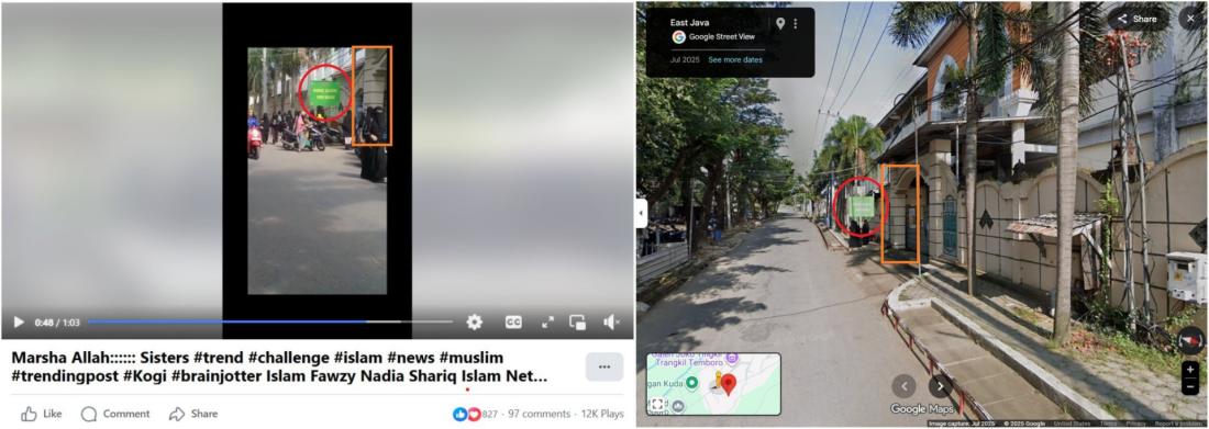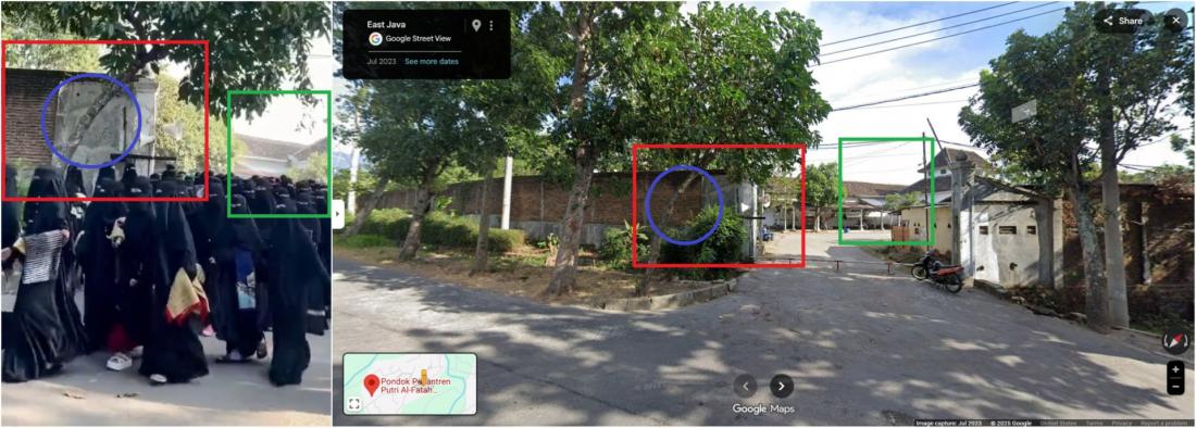 En el segundo 25 de la grabación, las mujeres pasan junto a una señal verde que dice “Pondok Al-fatah Putri Tahfidz”, que en indonesio significa “Internado Islámico Tahfidz para Mujeres Al Fatah”.