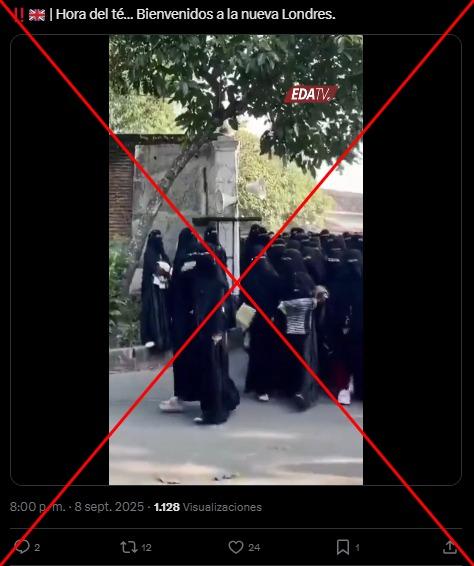 El vídeo, compartido en X por Hermann Tertsch, diputado del partido español Vox en el Parlamento Europeo, muestra un grupo de mujeres con nicab (velo que cubre el rostro con la excepción de los ojos) caminando. Tertsch lo difundió con la afirmación “Londres. Sí, Londres”.