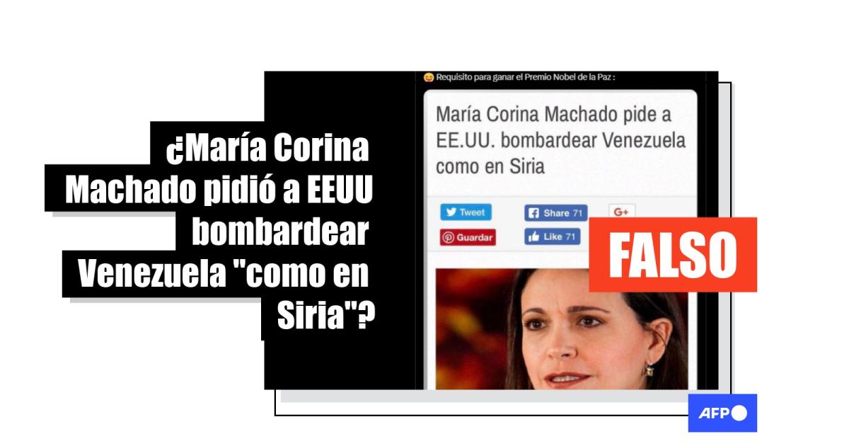 “Maria Corina Machado pide a EEUU bombardear Venezuela como en Siria”, dice un titular compartido como captura de pantalla en Facebook (1, 2) y X.