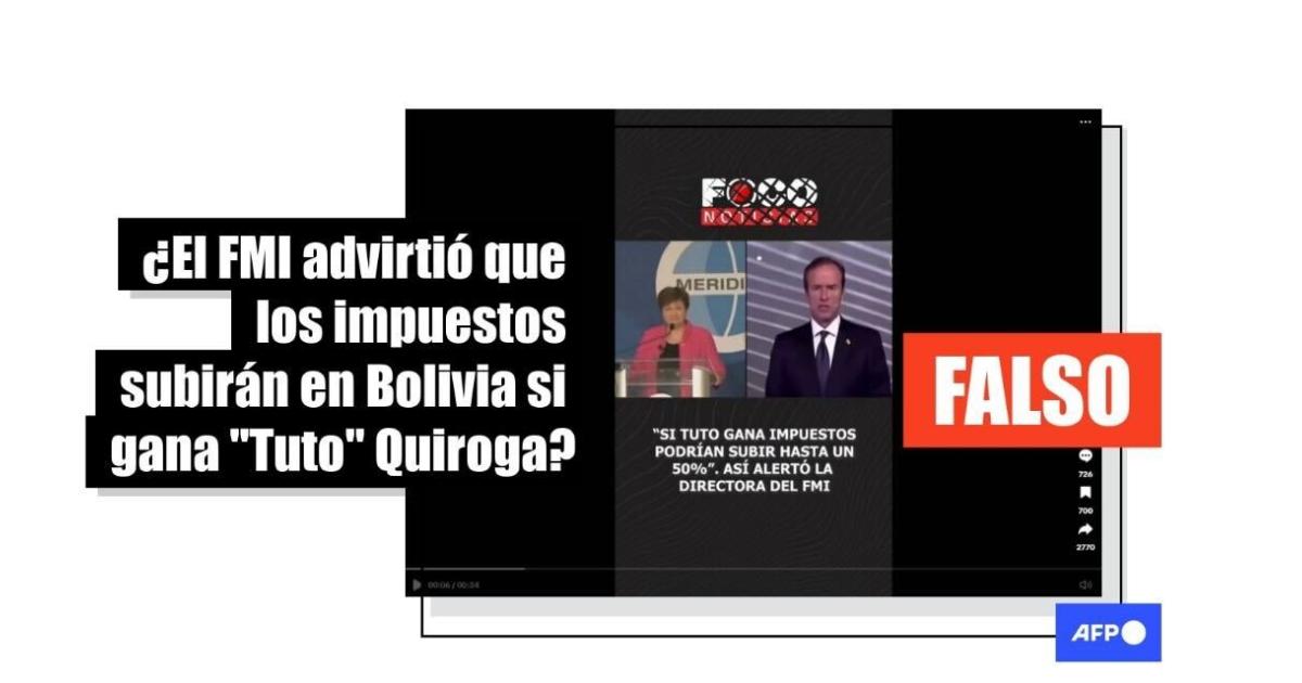 “Alerta económica para Bolivia. La directora del Fondo Monetario Internacional advierte que si ‘Tuto’ llega a la Presidencia, los impuestos podrían dispararse hasta en un 50%. El IVA, utilidades, importaciones y exportaciones estarían en la mira porque ‘Tuto’ tendría que cumplir con las obligaciones del préstamo de 12.000.000.000 que él mismo planteó en su propuesta. El bolsillo de los bolivianos sería el más golpeado. Usted se informa en Foco Noticias”, se escucha en un registro publicado en TikTok y Facebook.