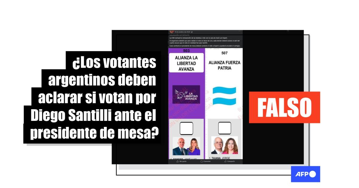 Luego de que el economista argentino José Luis Espert renunciara a su candidatura como diputado del partido La Libertad Avanza, la Cámara Nacional Electoral dispuso el 11 de octubre de 2025 que será reemplazado por Diego Santilli, pero que no se reimprimirán las boletas electorales con la imagen del nuevo candidato. En ese marco, más de 2.000 usuarios afirman en redes sociales que los votantes deben aclarar que su voto es para Santilli y no para Espert. Sin embargo, la CNE y especialistas explicaron que “se vota con normalidad” a pesar de que aparezca Espert en la boleta. Además, la ley electoral prohíbe revelar el voto.