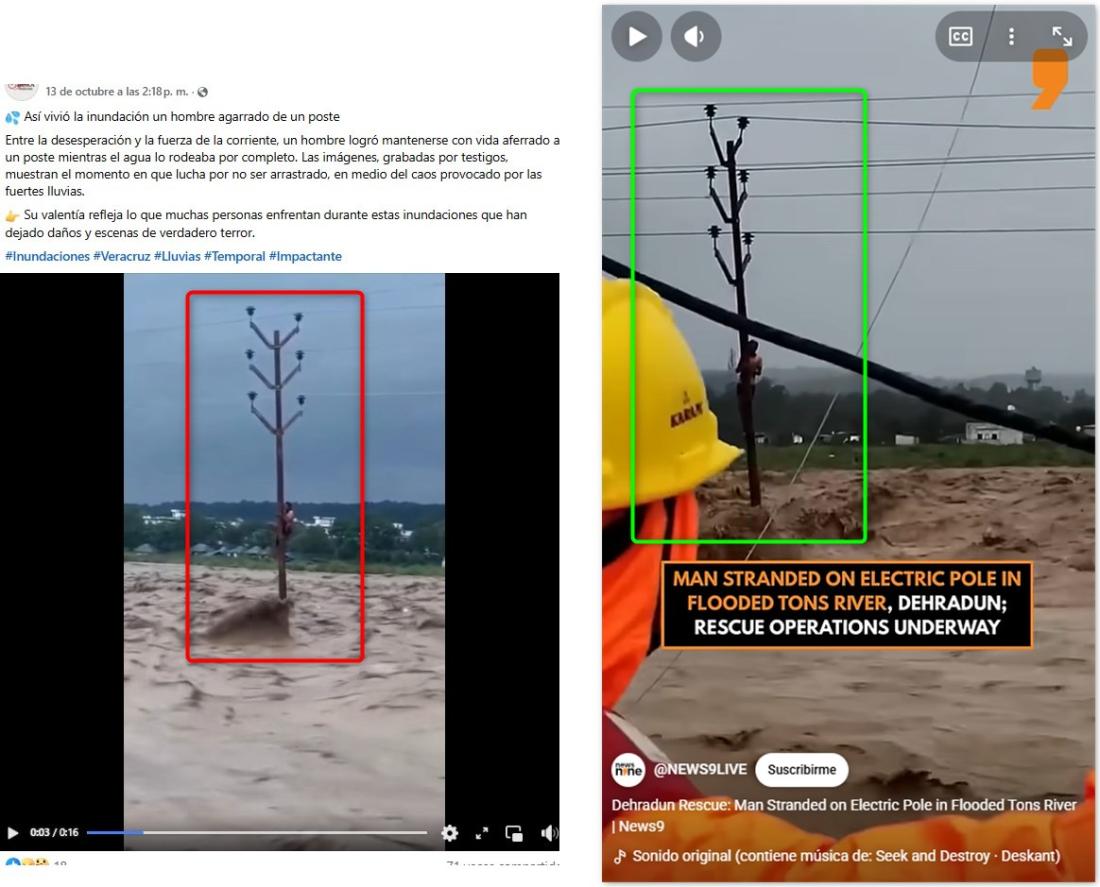 Las intensas lluvias torrenciales registradas en octubre de 2025 en el centro y este de México provocaron desbordamientos e inundaciones que dejaron decenas de muertos y desaparecidos. En ese contexto, se ha compartido más de 1.000 veces en redes sociales un video de un hombre aferrándose a un poste eléctrico, con la afirmación de que fue filmado durante la anegación en el estado de Veracruz. Pero la secuencia, en realidad, fue captada en otra inundación, registrada en India en septiembre de 2025.
