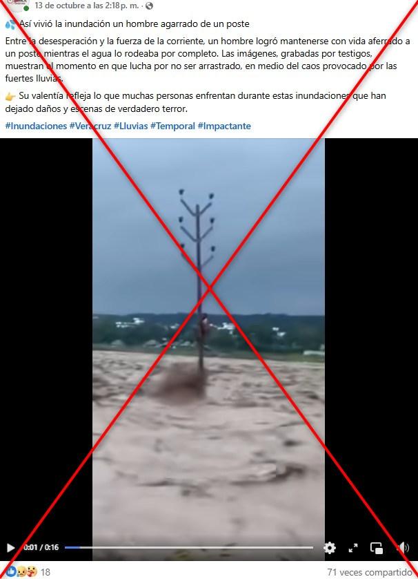 El video también circuló en Facebook (1, 2), con la afirmación: “Así vivió la inundación un hombre agarrado de un poste Entre la desesperación y la fuerza de la corriente, un hombre logró mantenerse con vida aferrado a un poste mientras el agua lo rodeaba por completo. (...) #Inundaciones #Veracruz”.