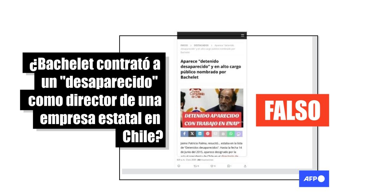 El 28 de septiembre de 2025 un reportaje de Chilevisión reveló el supuesto paradero en Argentina de la chilena Bernarda Vera, quien figura como desaparecida por la dictadura de Augusto Pinochet desde 1973. En ese contexto, se ha compartido en redes sociales más de 5.000 veces la afirmación de que la expresidenta Michelle Bachelet nombró a un supuesto detenido desaparecido llamado “Jaime Patricio Palma” en un alto cargo en la Empresa Nacional del Petróleo (ENAP). Sin embargo, el nombre no aparece en el listado de desaparecidos y desde la empresa descartaron que haya trabajado allí.