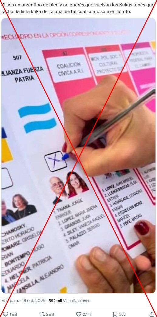 "Si sos un argentino de bien y no querés que vuelvan los Kukas tenés que tachar la lista kuka de Taiana así tal cual como sale en la foto", se lee en publicaciones en X, Facebook e Instagram junto con una foto que muestra una cruz en el casillero del partido opositor Fuerza Patria, cuya lista de diputados encabeza Jorge Taiana.