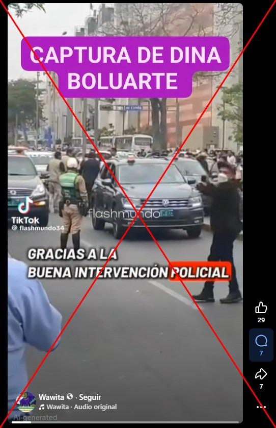 “Así fue el arresto de Dina Boluarte”, se lee en el cintillo con el que se comparte un video en TikTok, Facebook y X.