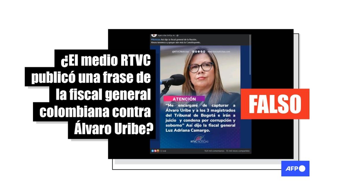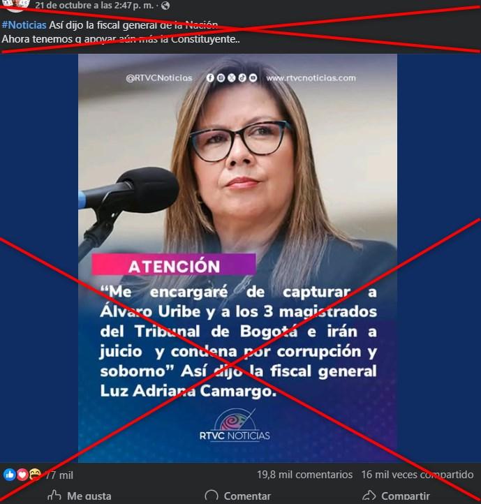 El 21 de octubre de 2025, la Justicia colombiana revocó una condena contra el expresidente Álvaro Uribe por sobornar testigos en un caso por su presunta relación con grupos paramilitares. En ese contexto, se ha compartido más de 16.000 veces en redes sociales una supuesta imagen del canal estatal RTVC, en la que la fiscal general de Colombia, Luz Adriana Camargo, asegura que se encargará de capturar al exmandatario y a los magistrados que revocaron su sentencia. Sin embargo, no hay registro de esa declaración, la pieza tiene inconsistencias gráficas y el medio desmintió haberla publicado.