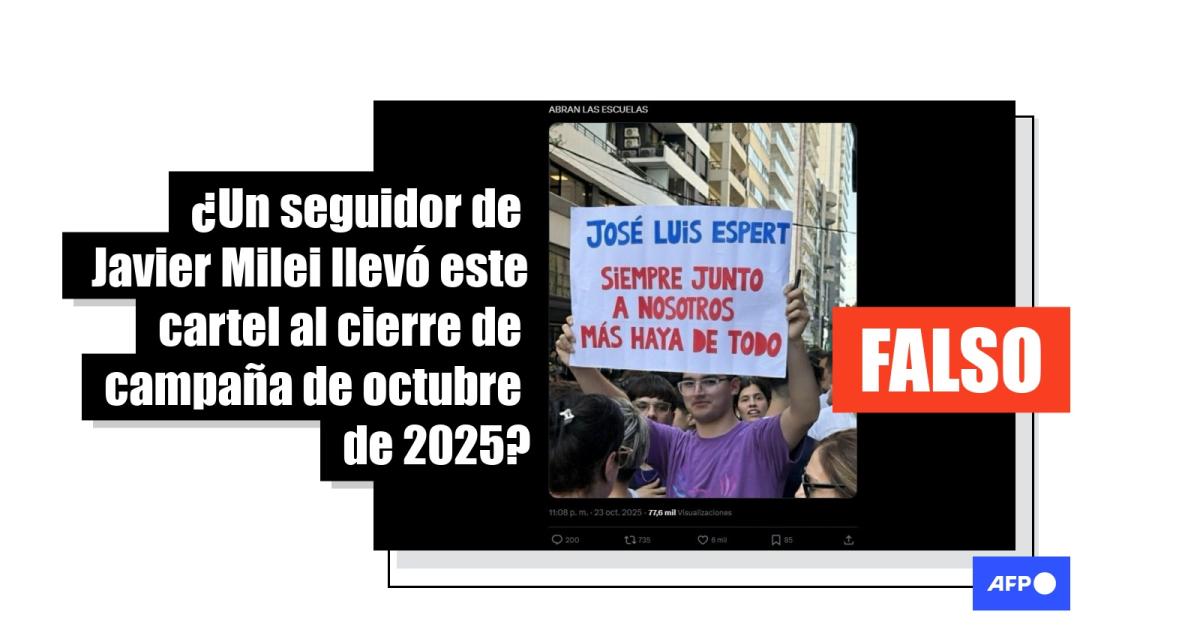 El presidente argentino, Javier Milei, cerró en la ciudad de Rosario la campaña de su partido de cara a las elecciones legislativas del 26 de octubre de 2025. En ese marco, circula más de 1.000 veces en redes sociales una foto de un joven con un supuesto cartel en apoyo a José Luis Espert, excandidato a diputado del partido oficialista, que renunció por presuntos lazos narcos. Pero el letrero, con faltas ortográficas que generaron burlas en línea, está editado. Registros de la AFP constatan que la pancarta mostraba una crítica a una candidata de un partido opositor.